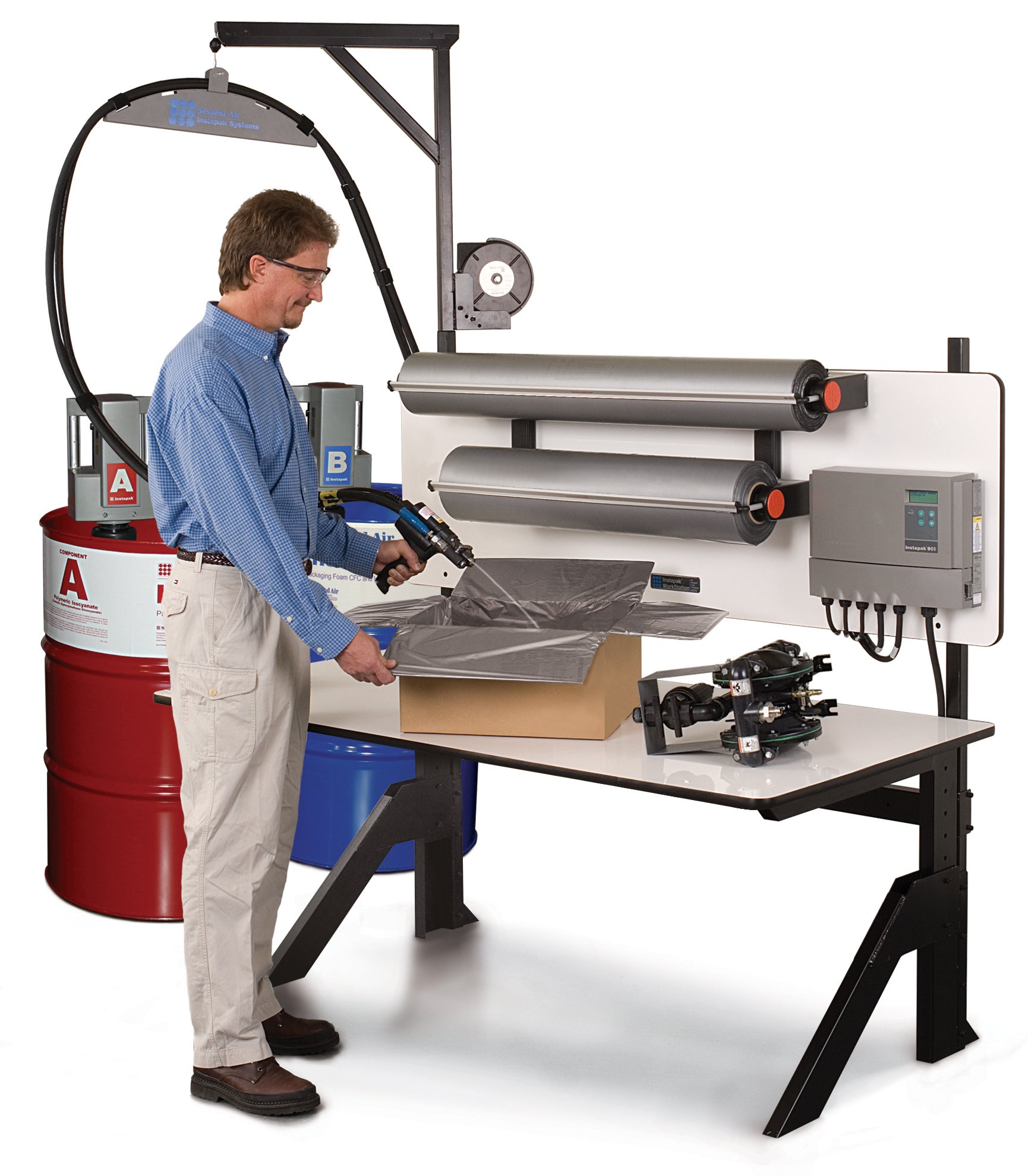 SEALED AIR® brand Instapak® 901 system intended for medium to high volume applications where pouring larger quantities of foam for larger cushions is required. The entire family of protective Instapak® foams in all container sizes are available. This system is ideal for applications where a large variety of product sizes and configurations are being packaged. Also ideal for very large products and applications. As a business grows and volume increases, the 901 system can be upgraded to use 275 gallon containers.